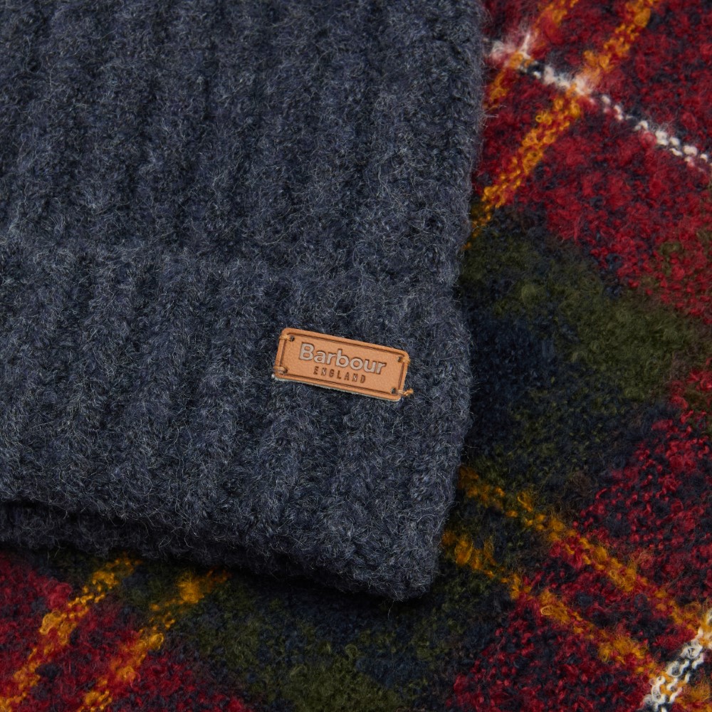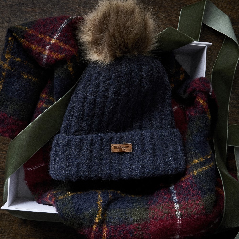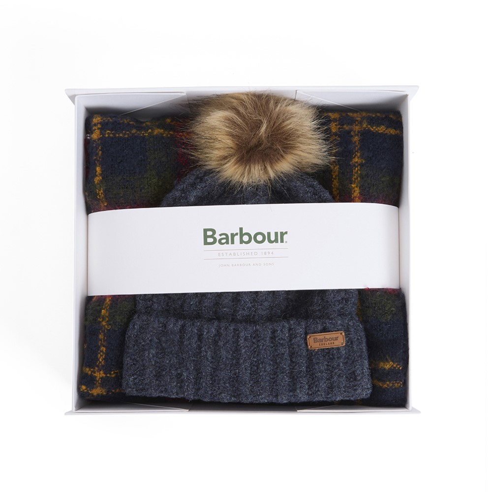 The Barbour Saltburn Beanie and Boucle Scarf gift set features a faux fur pom and tartan boucle scarf with tassels for the perfect present.